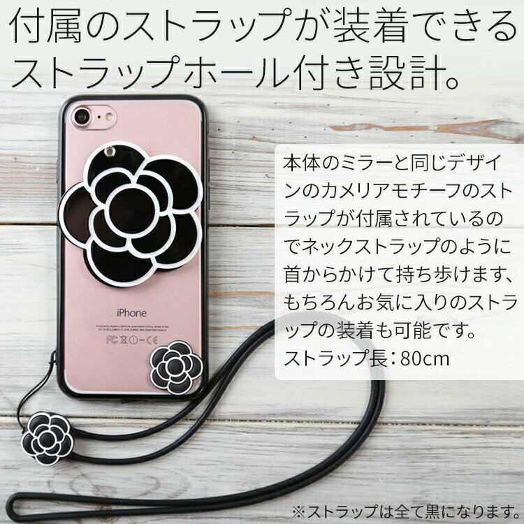 本体のミラーと同じデザインのカメリアモチーフのストラップが付属されているのでネックストラップのように首からかけて持ち歩けます、もちろんお気に入りのストラップの装着も可能です。