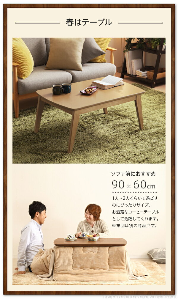 【セット構成】こたつ本体x1掛布団x1【カラーバリエーション】■こたつ本体ウォールナット(ブラウン)・オーク(ナチュラル)■掛布団オレンジ・ベージュ【仕様】■こたつ本体天板:天然木化粧繊維板(ウォールナット/オーク)幕板・脚部:天然木(ラバーウッド)石英管ヒーター(300W、中間スイッチ式)◎一部組立■掛布団表地:ポリエステル100%(はっ水・防汚加工)裏地:ポリエステル100%中綿:ポリエステル100%【サイズ】■こたつ本体幅90x奥行60x高さ39.5cm重量:約14kg天板サイズ:幅90x奥行60cm・厚み30mm・約7.4kg■掛布団サイズ:200x170cm・中綿:約330g株式会社ナカムラ(I-5701070)